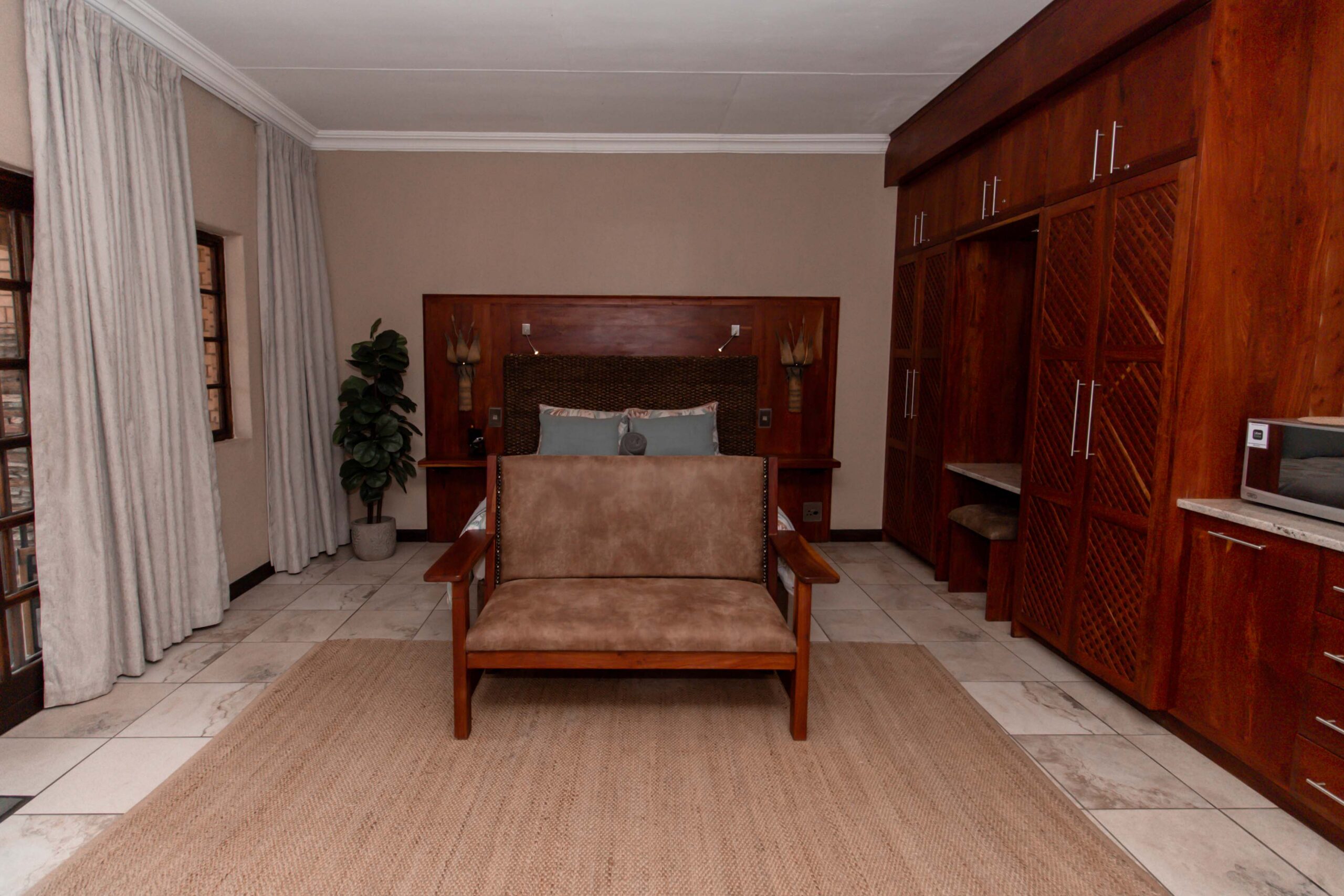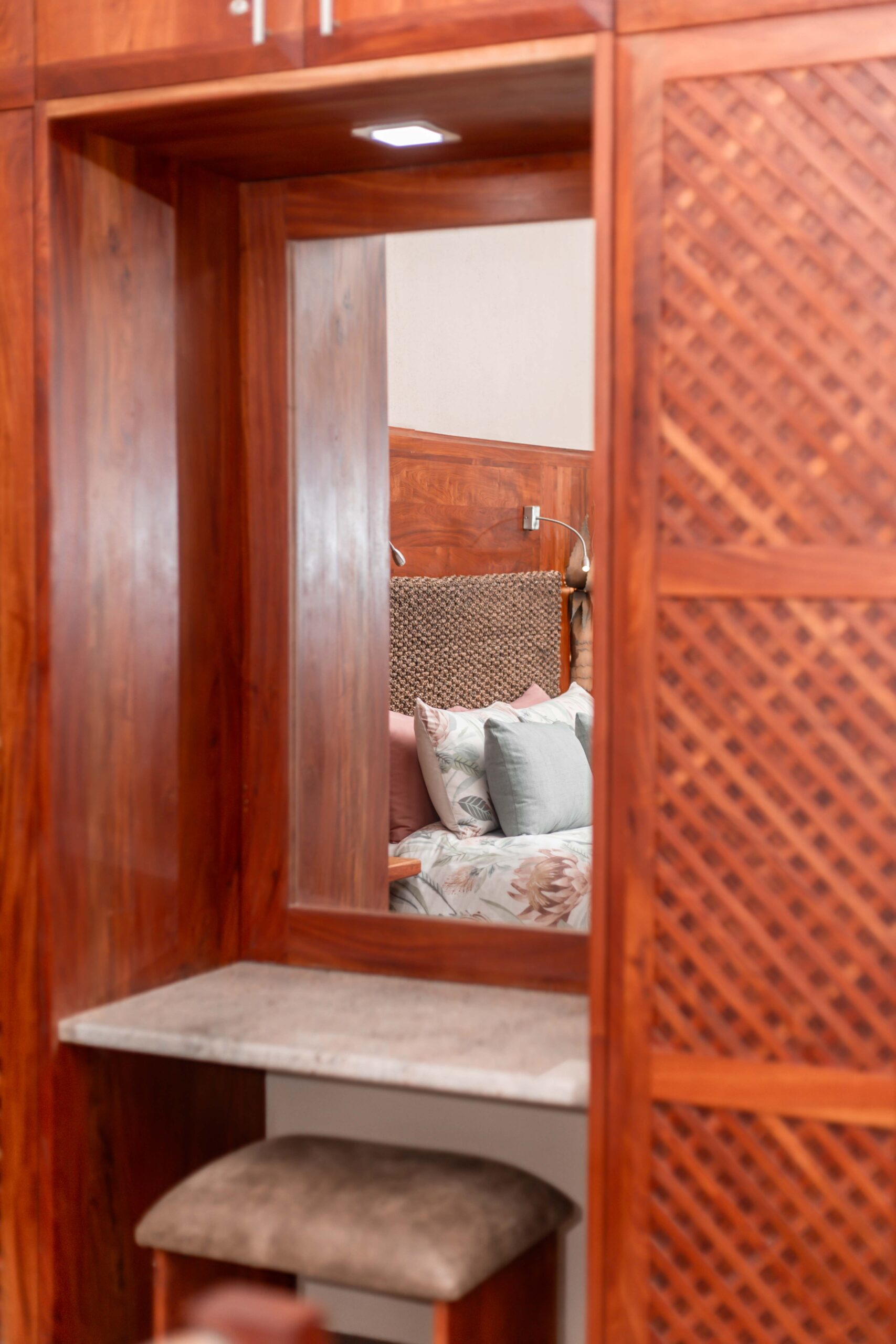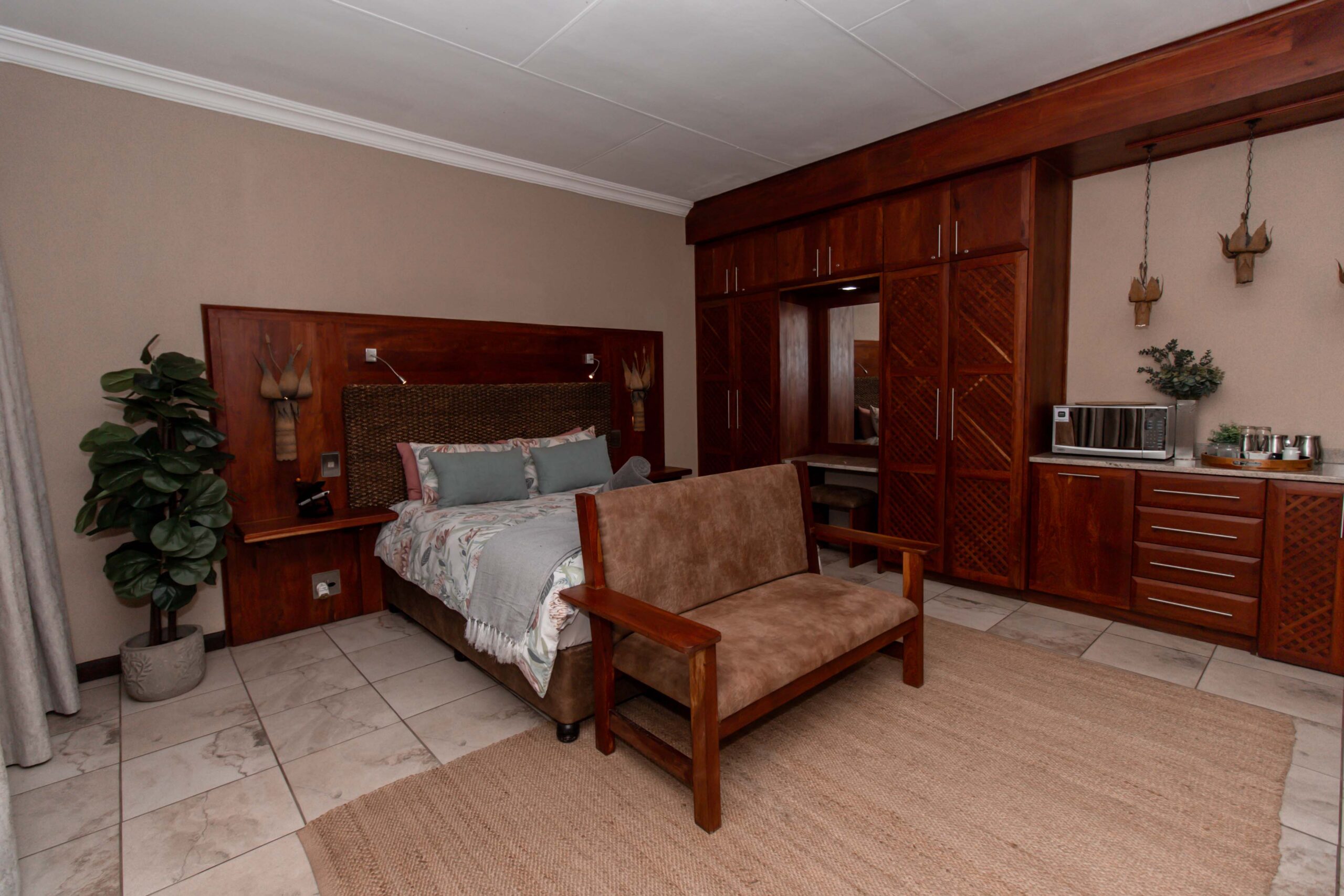 At Lodge Aloe-Hymn, our rooms are designed with tranquil earthy tones, beautiful rosewood cupboards, and warm wood finishes that create a peaceful and luxurious atmosphere.