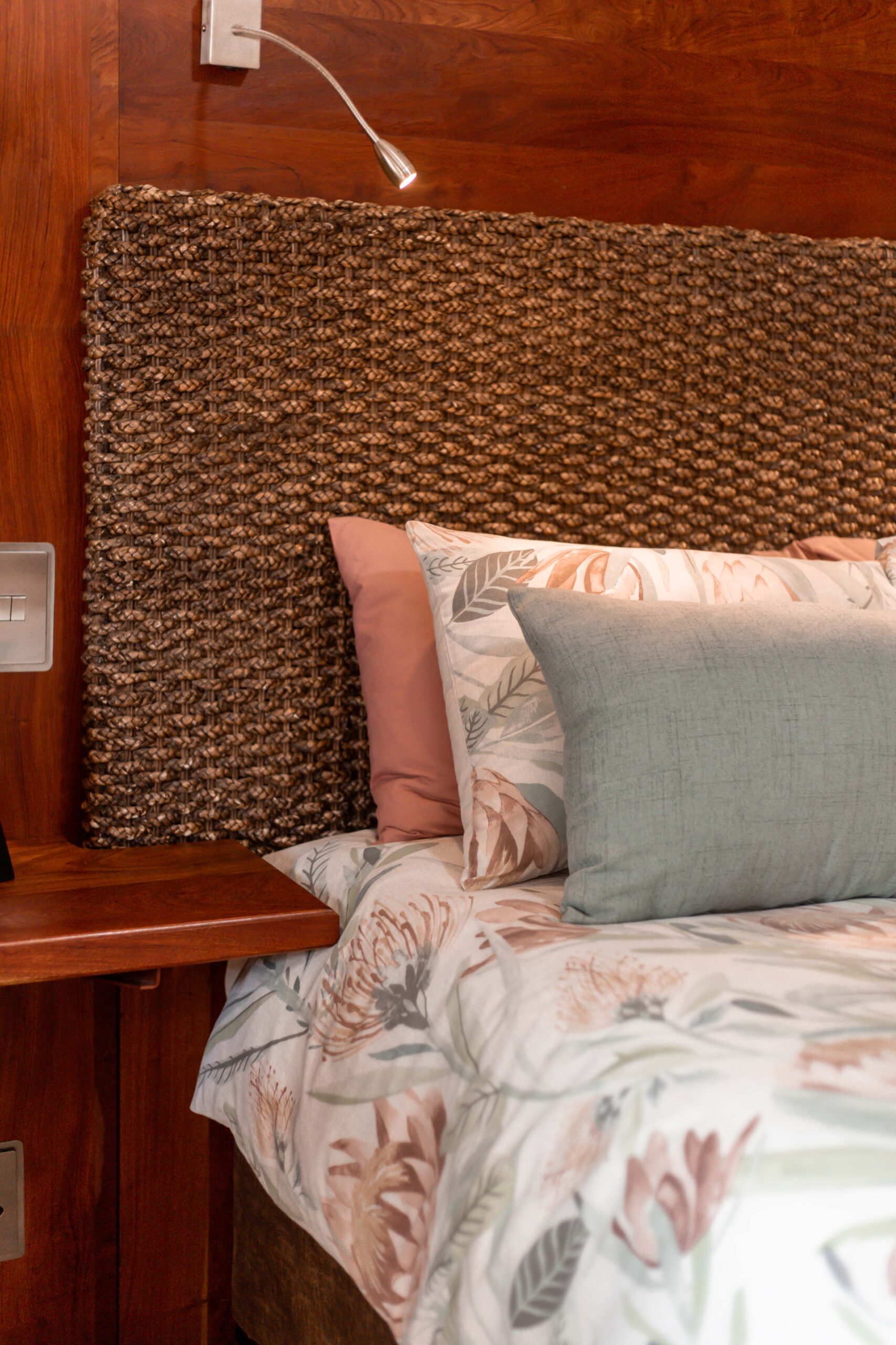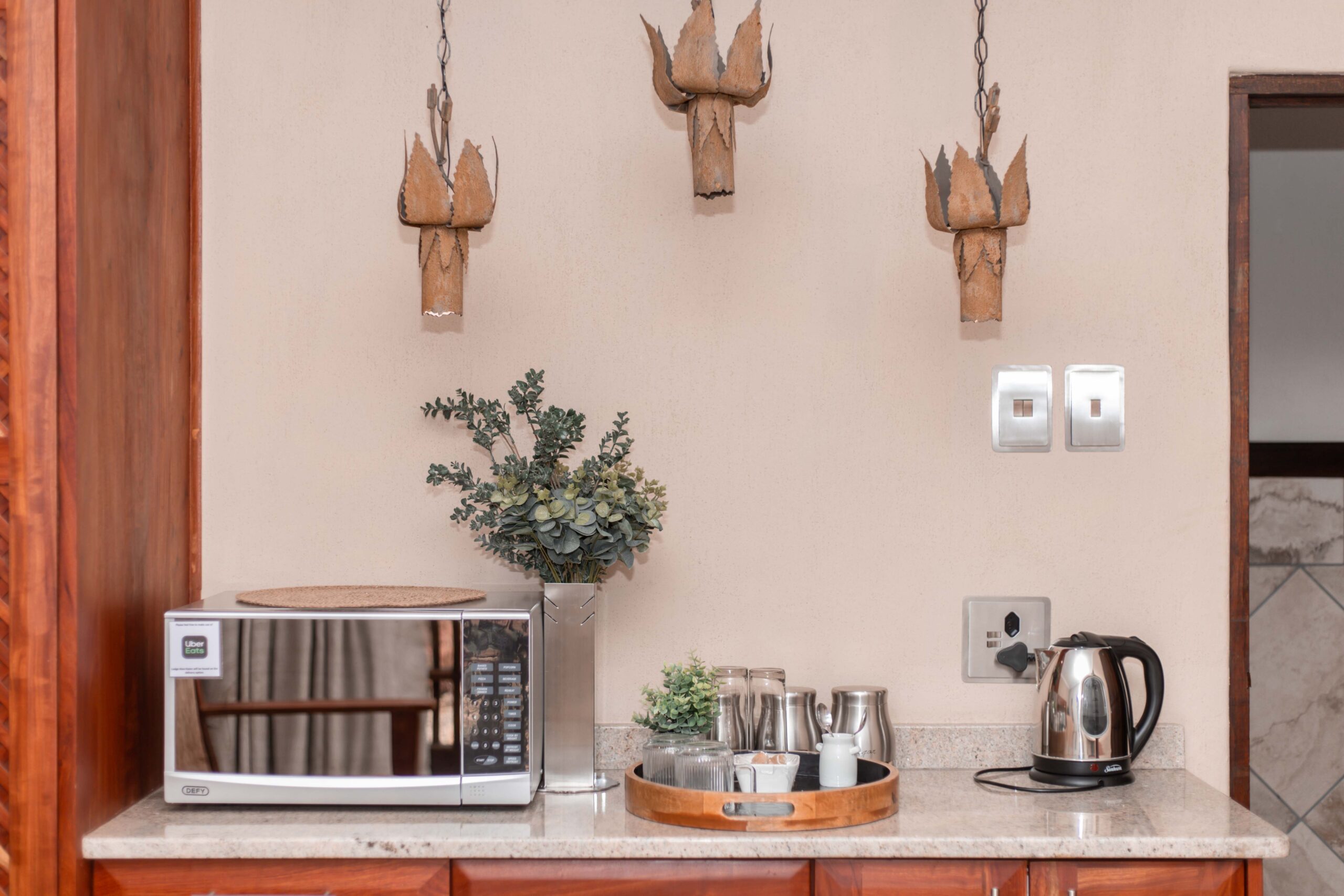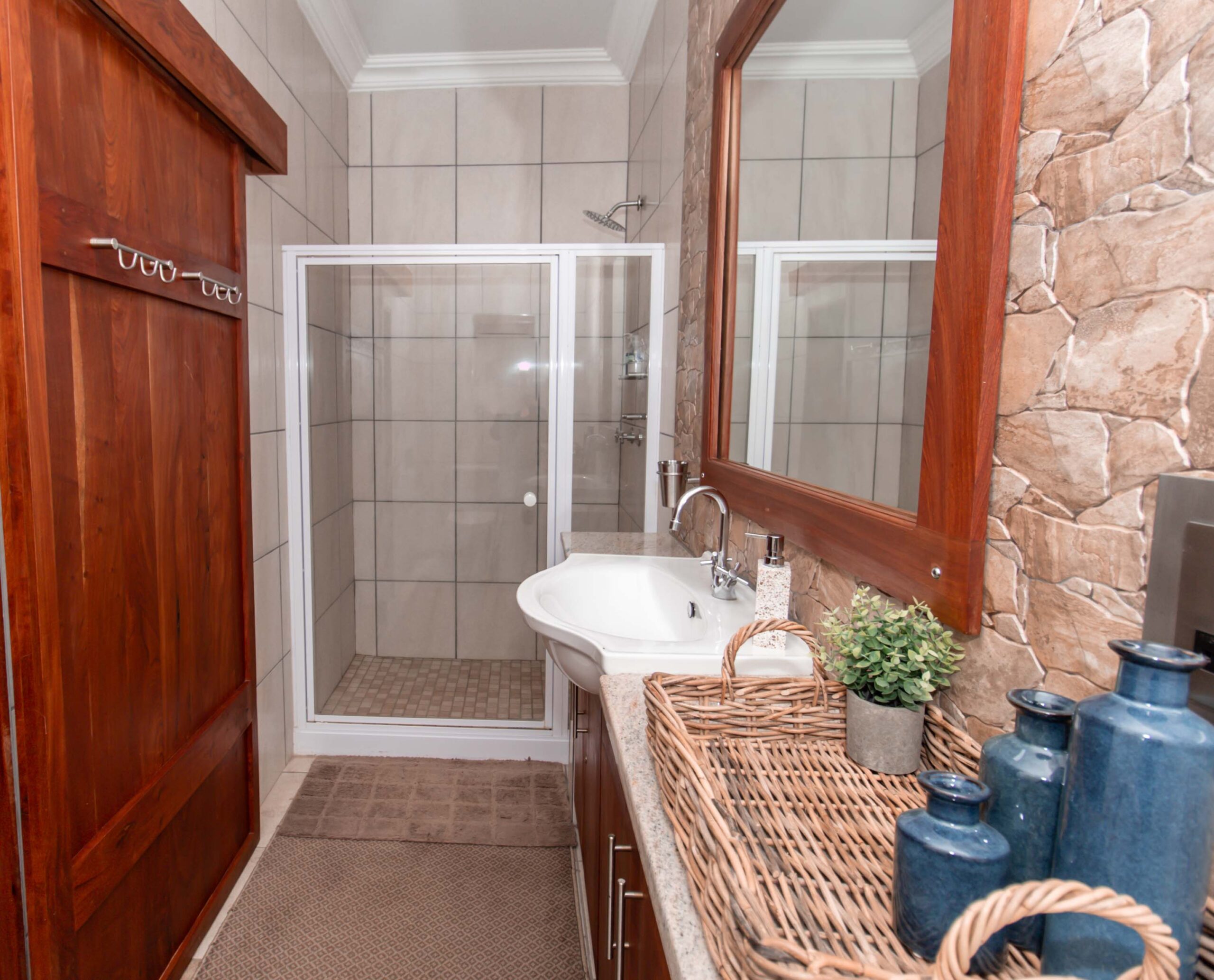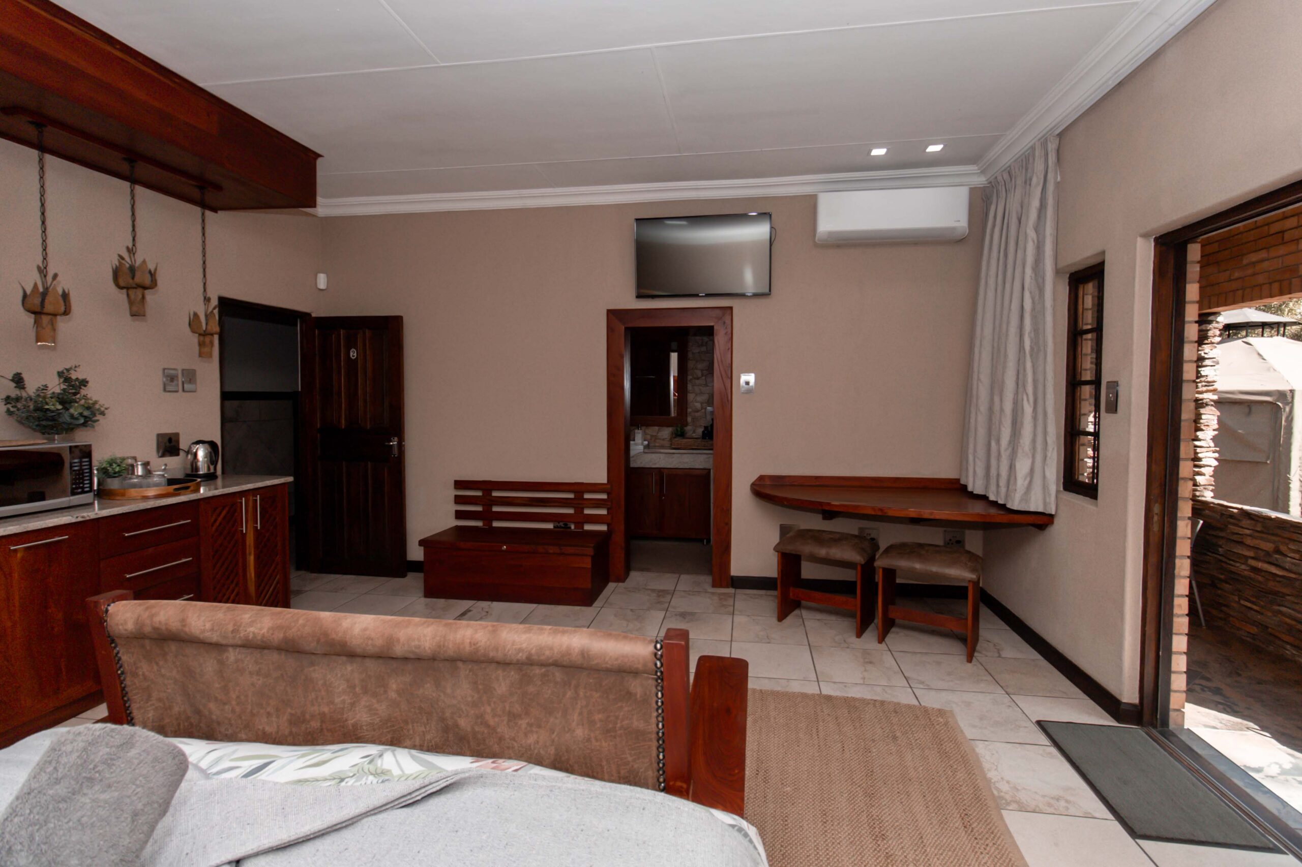 At Lodge Aloe-Hymn, our rooms are designed with tranquil earthy tones, beautiful rosewood cupboards, and warm wood finishes that create a peaceful and luxurious atmosphere.