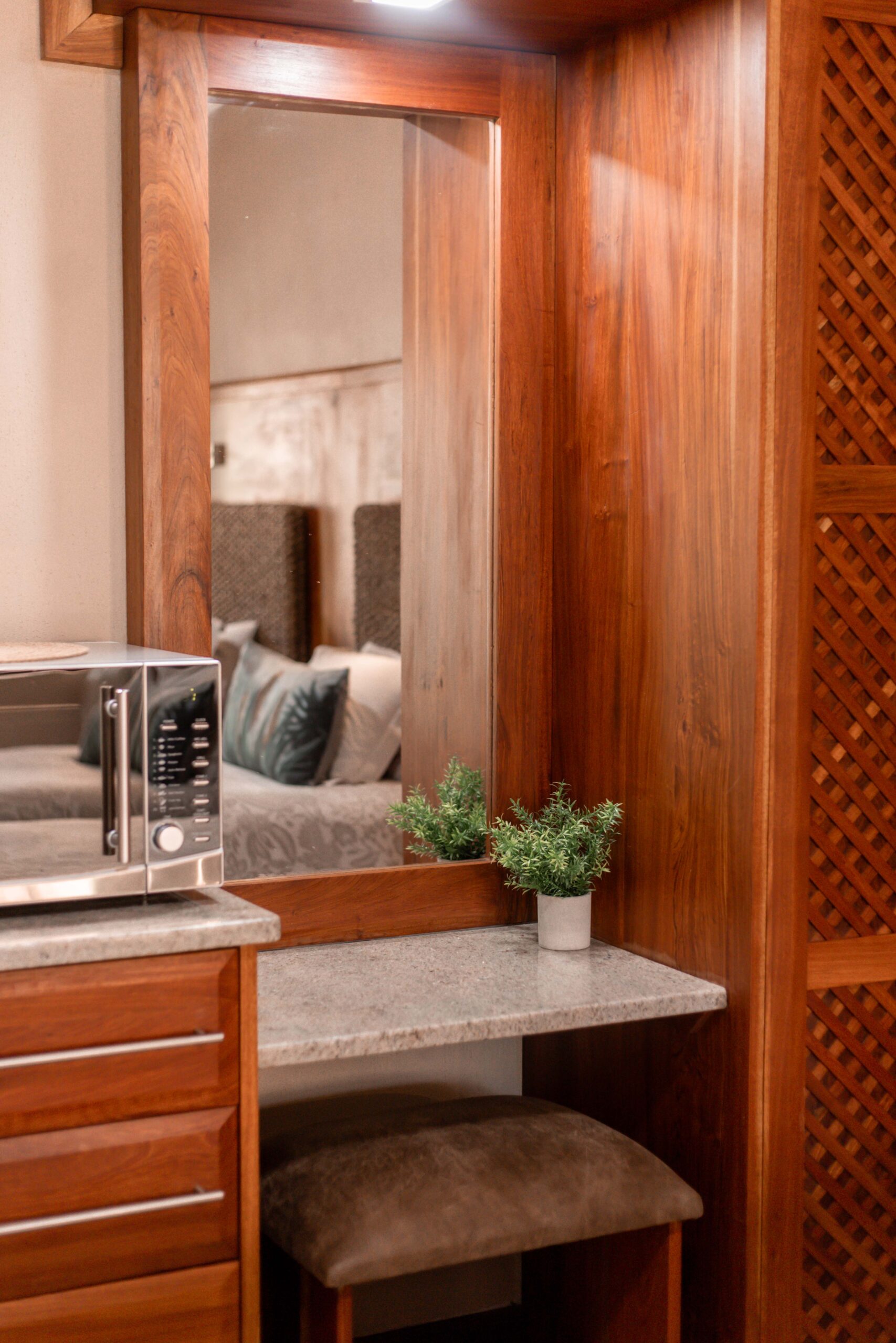 At Lodge Aloe-Hymn, our rooms are designed with tranquil earthy tones, beautiful rosewood cupboards, and warm wood finishes that create a peaceful and luxurious atmosphere.